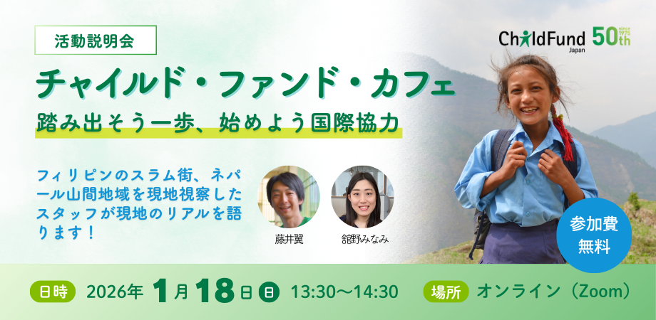 チャイルド・ファンド・ジャパンでは、1月18日(日)、オンラインでの活動説明会「チャイルド・ファンド・カフェ 」を開催します!