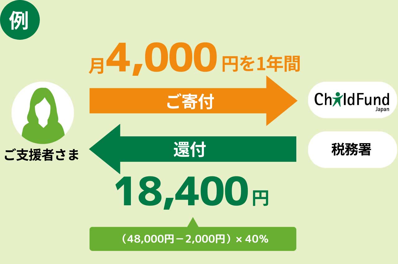 - はい、認定NPO法人であるチャイルド・ファンド・ジャパンへのご寄付は税額控除の対象となり、年間のご寄付の2,000円を超える金額のうち、40%が所得税から控除されます。