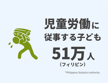 フィリピンでは、86万人の子どもたちが働いているとされ、その中でも51万人は、子どもにとって安全でない有害な「児童労働」に従事しています*。